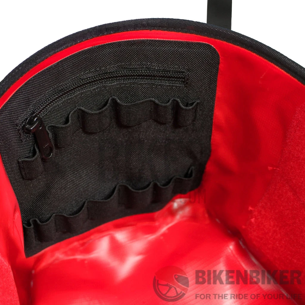 Inside the tank bag, there is a red inner lining for high visibility. There is also a fold-away partition that allows you to divide the tank bag into separate areas. It can either be folded away or removed when not needed. The fold-away partition, the zipper pocket on the partition, the zipper pocket in the main compartment along with various holding loops in the main compartment, enable all your bits and bobs to be stored in an organized and readily accessible manner. There is a document pouch that attaches to the inside of the lid with velcro. This is perfect for carrying bike papers, passports etc. on those long haul trips and the tank bag also has a pen holder and key ring built into it too!